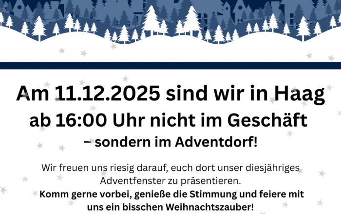 Informationen über unsere Weihnachts-Öffnungszeiten, sowie unser Adventfenster im Adventdorf!